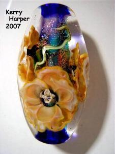 There’s something about KERRY (HARPER) Have you ever wondered, what makes an established hot glass bead artist in our neck of the woods? Read here and find out all about it. Kerry IS, literally a real winner, for she has won different awards in other art forms prior to winning this year’s first prize award for her lovely encased flower beads. In the pictures provided of Kerry’s artworks, we start off with a tassel she hancrafted. This tassel won first prize at the 2004 The Sydney Royal Easter Show and made it into the Standard of Excellence case. Something about Kerry: She has dabbled with lots of other crafts prior to lampworking, starting from early childhood. This includes working with all kinds of fibres and she has about 20 years experience in making tassels. She claims she has been influenced and encouraged by her mother, a painter and a bit of a sculptor, to develope in the arts. In addition, she has been seed bead weaving for 6-7 years. Please refer to the picture. Kerry’s daughter - Tracey, is wearing the Eye of the Tiger necklace. This won first prize for beaded jewellery at The Sydney Royal Easter in 2004. Please note: Kerry hasn’t entered any competitions, since then, until this year. As for Lampworking: Kerry states that she has been making beads for nearly four years. The lack of beautiful lampworked beads in local bead shops, prompted her attend a beginner’s class at a stained glass shop. Here, she said… “I learned about safety, how to light the torch, pull a stringer and twisty and how to make a basic round bead. Everything else I learned from reading all the forum, meeting/sharing tips with my lampwork buddies once a month and practicing.” She claims she gets her inspiration from nature: colour, flowers, beautiful scenery, sunsets and mountains and working towards expressing it in beads in the future. About her Studio: Kerry said, it’s what used to be the pool side cabana and added because her bikini days are over (hehehe). She handcrafts glass beads as a hobby and sells some to buy more glass to make more beads. About teaching others: Kerry doesn’t at the moment, because she considers herself still learning, disorganized and never writes anything down. It’s really by choice, because she enjoys “rediscovering the wheel” each time she torches. To name her most popular or signature bead, Kerry says “..it will probably be the encased red day lily flower. It’s the most popular.” She added, “…I like a little challenge…” that is, “…to get the flowers in there and keep the bubble out”. It is always a great honour to meet a fabulous hot glass bead artist, especially one who is so down-to-earth and whose skills equal or even better many overseas counterparts. |